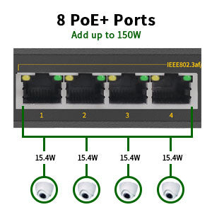 Assign a total of 150W PoE+ power across all ports based on the device connected. If connecting eight cameras requiring 15.4W each, 150W power will be split equally to 8 ports.
