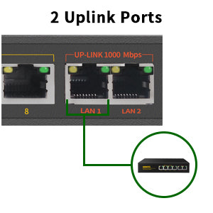 The PoE+ has an extra uplink port, making network setups easier and more convenient. With one uplink port connected to the router, the other uplink can be connected to another PoE+ switch, a NVR, or any non-PoE+ equipment, allowing you to save a port on your main router / switch.